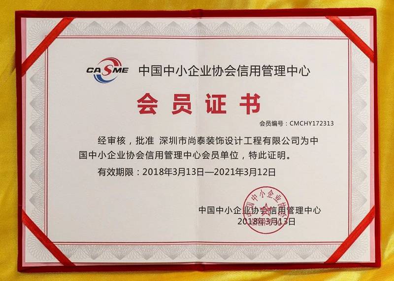 2018年3月13日,中國中小企業(yè)協(xié)會(huì)為深圳市尚泰裝飾設(shè)計(jì)工程有限公司頒發(fā)了企業(yè)信用等級證書,對深圳市尚泰裝飾設(shè)計(jì)工程有限公司的信用狀況進(jìn)行了評價(jià),結(jié)果為AAA級,證書編號:201711611117623。同時(shí),中國中小企業(yè)協(xié)會(huì)信用管理中心批準(zhǔn)深圳市尚泰裝飾設(shè)計(jì)工程有限公司為中國中小企業(yè)協(xié)會(huì)信用管理中心會(huì)員單位。