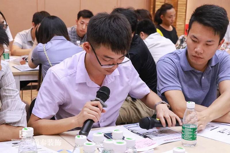 第一天的課程高潮迭起,尤其是在實(shí)景模擬第一次與“客戶”電話邀約環(huán)節(jié),每一組代表設(shè)計(jì)師都要在“眾目睽睽”之下?lián)芡ā翱蛻簟彪娫挘私狻翱蛻簟毙枨?,想方設(shè)法獲得更多的“客戶”信息,邀約“客戶”見面,化解“客戶”的種種“刁難”,并且“客戶”會一直“陪伴”到整個(gè)培訓(xùn)課程結(jié)束,親臨現(xiàn)場聽取設(shè)計(jì)師的最終“方案匯報(bào)”,通過最接近真實(shí)的模擬演練,真正達(dá)到培養(yǎng)設(shè)計(jì)師營銷能力與設(shè)計(jì)能力的高強(qiáng)度學(xué)習(xí)效果!