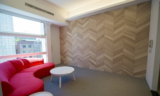 員工休息室用橡木木紋取代原有的油漆墻面,當(dāng)作員工休息室的主墻,也豐富北歐風(fēng)休憩的氛圍。