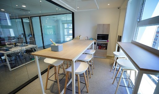 前房客其中一間會(huì)議室用來(lái)改裝員工休息室,我們以白色和橡木為基調(diào),采用白色桌腳,搭配橡木桌面,形成員工休息室的吧臺(tái)桌,搭配白色椅面吧臺(tái)椅,溫馨舒適,富有人文氣息。