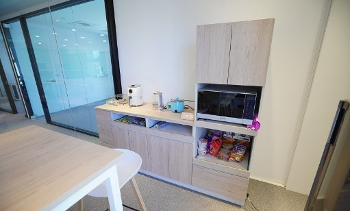 員工休息室必備的茶水柜,滿足員工的口欲,不只妥善安排電器的空間,更安排零食置放空間,方便員工拿取,讓員工擁有幸福感。