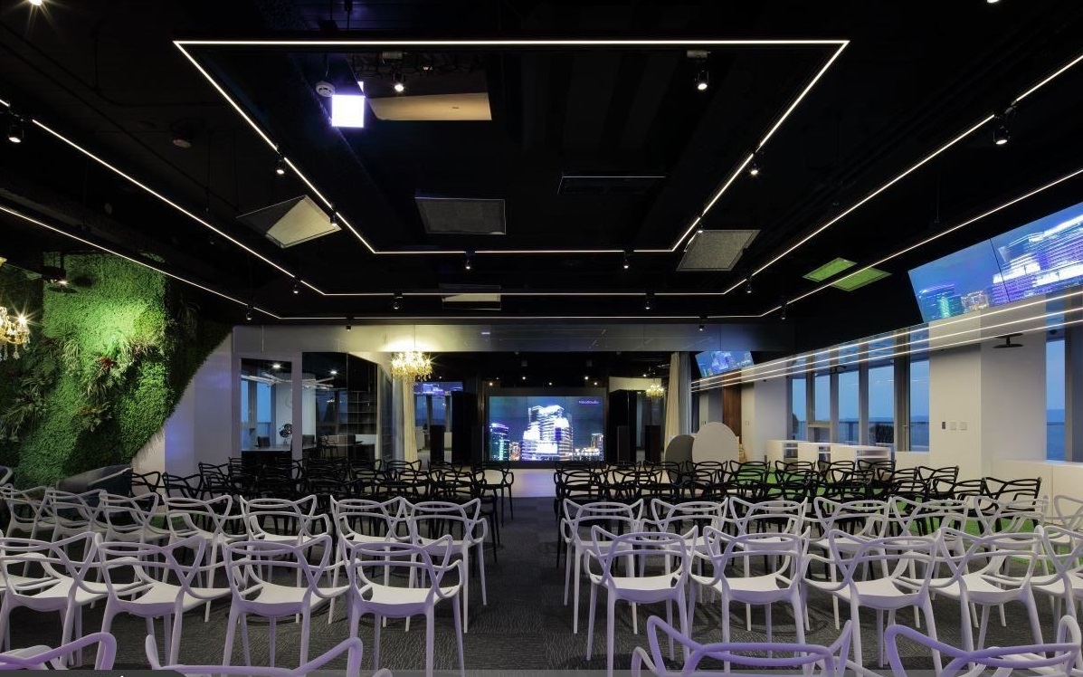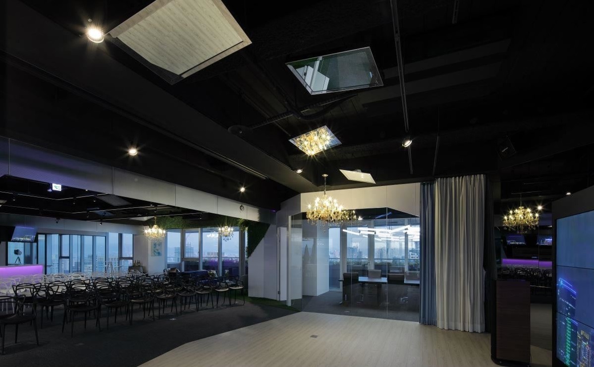 整個(gè)空間跳脫了格局的限制,設(shè)計(jì)師以大量不規(guī)則的線條語匯,包括多層次的線性光帶、噴黑的天頂結(jié)構(gòu)、管線等創(chuàng)造活潑視感,也達(dá)到視覺極致延伸的效果,連展演區(qū)座椅的采購,也選擇黑白雙色、并擁有鮮明線條造型、易于收納的款式,與現(xiàn)場的黑白灰階基調(diào)相呼應(yīng)。但除了沈穩(wěn)兼具個(gè)性的中性灰階之外,也不忘融入塊體、幾何元素的穿針引線,醞釀全區(qū)源源不絕的動(dòng)態(tài)活力,像是一旁休憩區(qū)鋪設(shè)的人工草皮、用于重點(diǎn)端景立面的植生墻綠意、以及和整體現(xiàn)代簡約風(fēng)格強(qiáng)烈對比的古典水晶燈等等,都為空間感官帶來豐富的藝術(shù)養(yǎng)分!