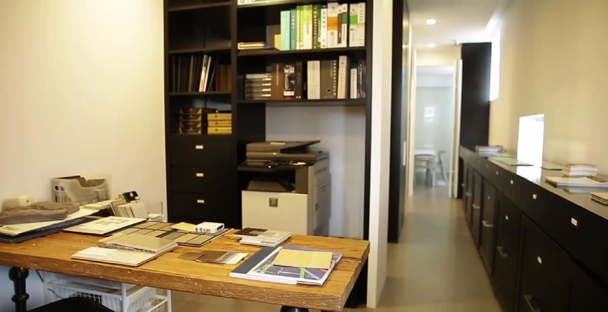 整間辦公室,從進(jìn)門到底,分成三個(gè)區(qū)塊,會(huì)發(fā)現(xiàn)空間以彩、白、黑的層次,創(chuàng)造空間流動(dòng),材料室以深色,一方面能讓材料更為凸顯,空間也能營(yíng)造出沉穩(wěn)氛圍,從色彩上引導(dǎo)心情更加安定,讓選擇上能做出更正確的決定。