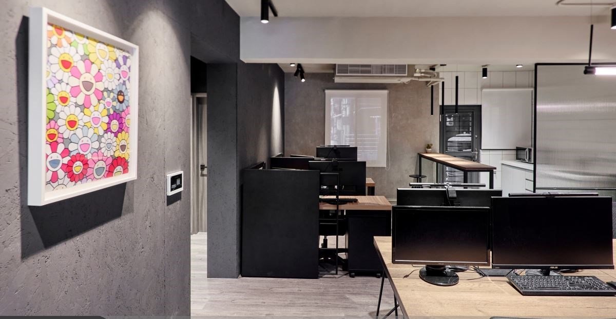 跳脫商業(yè)空間的思維,以個性工業(yè)風作為基底,辦公桌以木桌搭黑鐵腳設(shè)計,系統(tǒng)板材打造個人抽屜柜;開放式的桌面像是咖啡廳里面的大長桌,可以專注工作也方便與同事相互討論交流。茶水間植入高腳吧臺座位,半透明的長虹玻璃隔屏帶給休憩區(qū)隱私,同時又不會生硬地切割空間;冰冷的天花板照明改成軌道燈,偏暖的色溫搭配可以調(diào)整照明角度的設(shè)計,會讓空間多幾分溫暖,同時也能打在墻面創(chuàng)造光影的變化趣味。廊道上與空間轉(zhuǎn)角擺放著色彩繽紛的藝術(shù)掛畫以及公仔玩偶,每個轉(zhuǎn)角都帶著驚喜,也能激發(fā)活力與創(chuàng)意;而戶外陽臺擺放張椅凳搭配大型落地植物,創(chuàng)造一個自然充電的角落。