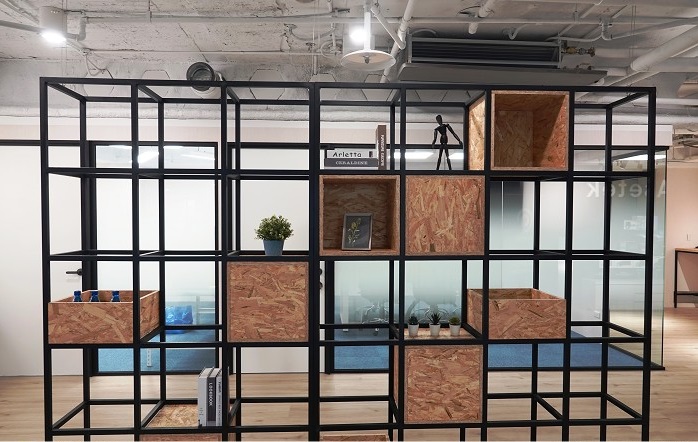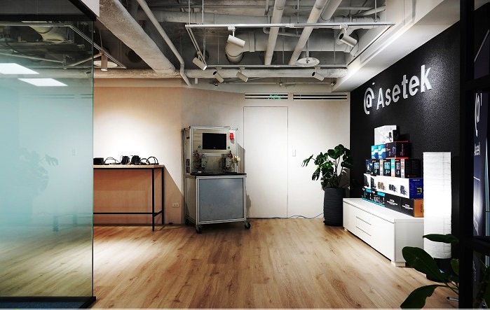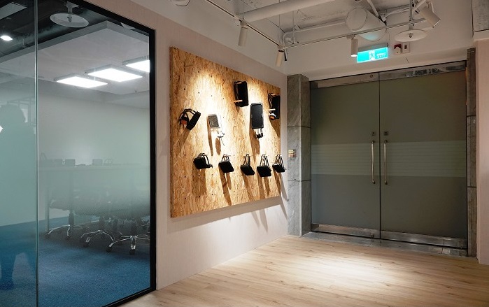 一進(jìn)入辦公室公司名稱及產(chǎn)品印入眼簾,承襲公司一貫的簡(jiǎn)約風(fēng)格,深色墻面搭配純白字體將視覺集中于產(chǎn)品上,讓產(chǎn)品成為空間的裝飾品,不做過多的設(shè)計(jì)搶走產(chǎn)品的重要性;展示墻使用OSB洞洞板負(fù)責(zé)吊掛陳列商品,配合不同需求變化各種展示方式。