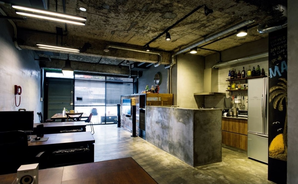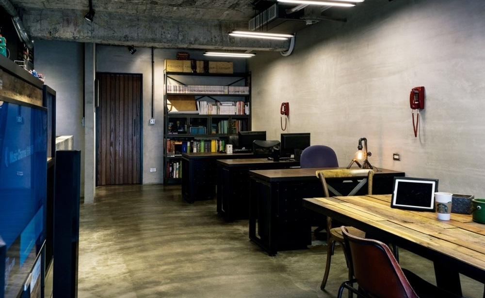 由于是將工作室結合臨時住宅的機能,方便兩人與同事工作之馀也能在這個空間休憩與沉淀,因此開放的格局及多元動線規(guī)劃是首要考量,將原本陽臺連結室內的隔間拆除,采用大面玻璃窗及采光罩,導入大量光線,加上貨柜門的大門,從這里就感受到粗獷隨興的工業(yè)風格;公共區(qū)域除了工作區(qū)外,設計師將原本在屋后端的廚房移到公共空間,用水泥粉光打造中島吧臺,營造出個性又原始的廚房,結合原木大餐桌的形式,讓這里成為員工開會及接待顧客的場域,也可以是休閑放松的客餐廳及聚會場所,廚房旁邊的客衛(wèi)隔間墻采用黑板漆打造涂鴉墻,設計師特別為客衛(wèi)打造一扇宛如監(jiān)獄門的門片,增加不少趣味性,也展現(xiàn)設計師的創(chuàng)意、風格及個性。