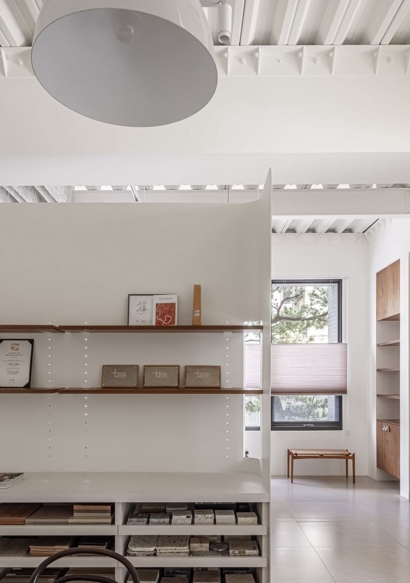 二樓主要辦公空間采開放式設(shè)計(jì)優(yōu)化空間感與采光,也方便工作時(shí)彼此交流討論;靠窗處以白色貨架打造的書墻有活動(dòng)輪可恣意移動(dòng),白色軌道燈能隨時(shí)調(diào)整照明角度、存在感也不過于強(qiáng)烈而壓迫空間;另一側(cè)則運(yùn)用梁下空間以木作打造收納柜,滿足工作所需的儲(chǔ)藏空間亦能感受到辦公室留白的清爽感受。