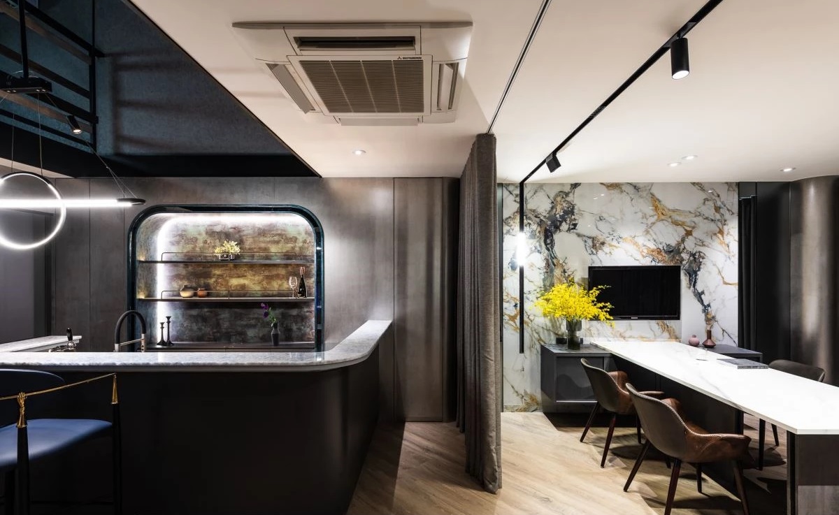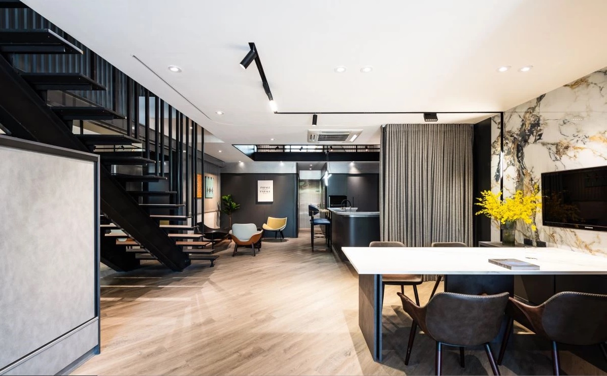 進入辦公室沒有制式的柜臺,而是會客桌和展示區(qū),利用高挑的空間,安排前衛(wèi)的橢圓造型吊燈,充滿氣勢和意象。兩旁是廚具和衣柜等展示區(qū),考量到之后可能改變商品陳設(shè),墻面盡量以素面灰色調(diào)為主。中間天花較低的過渡區(qū),作為內(nèi)部開會區(qū)域,以大理石花紋美耐板位會議區(qū)鋪陳質(zhì)感。吧臺區(qū)運用復(fù)古元素和現(xiàn)代設(shè)計語匯,深綠色的美耐板帶出英式韻味。二樓是辦公區(qū),安排玻璃圍欄,遠看辦公區(qū)好像懸浮在空間中,既呼應(yīng)主題,也有放大空間視覺感的效果。