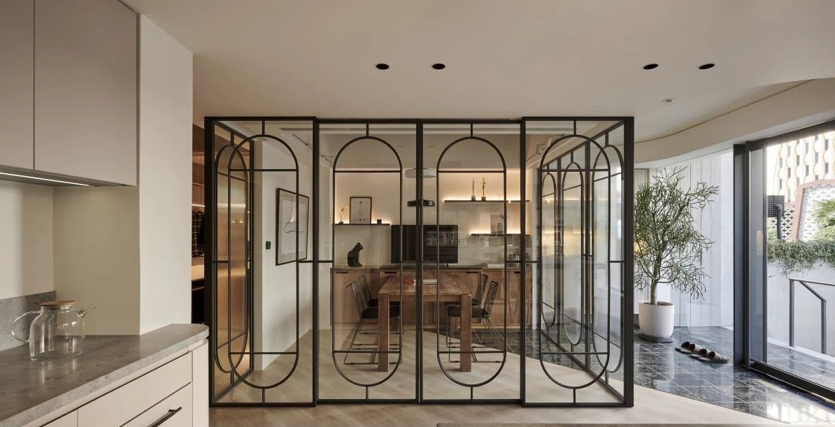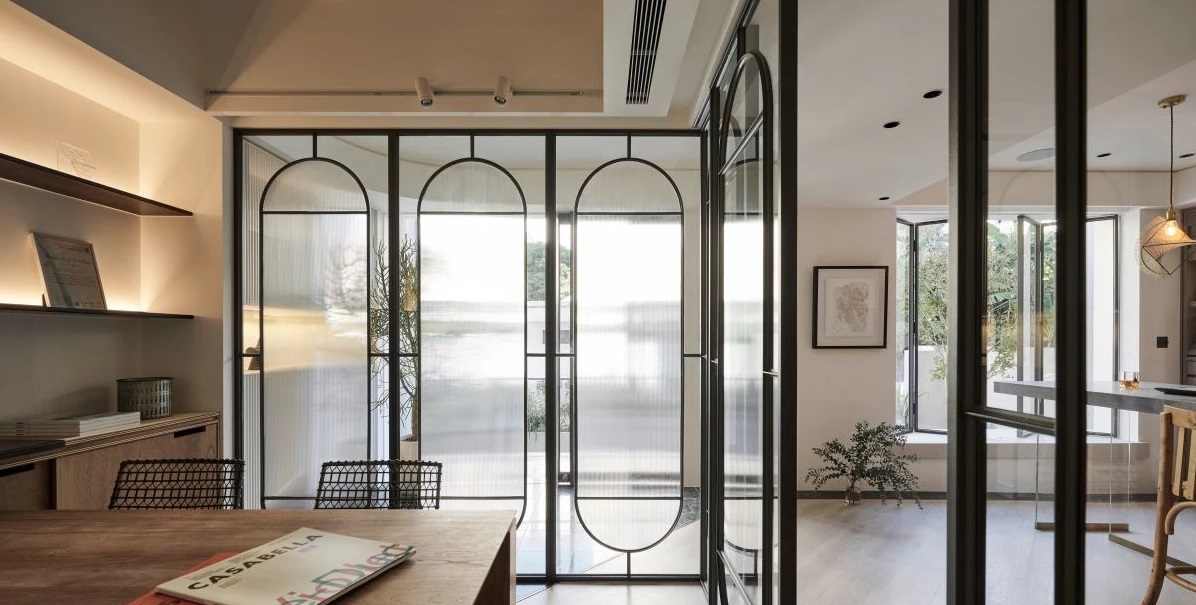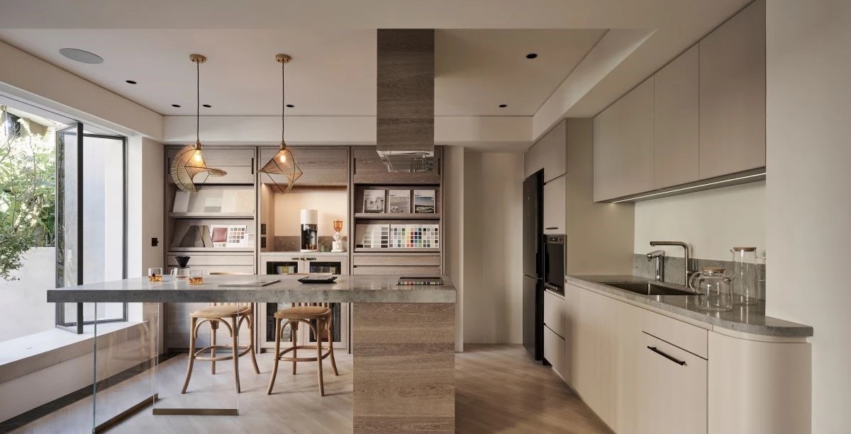 鄰近玄關的會議區(qū)利用小冰柱結(jié)合清玻璃的造型鐵件隔屏,不同紋路的玻璃屏風創(chuàng)造空間感與隱私性的完美平衡。設計師工作區(qū)安排在屏風隔墻后方,水泥裸梁及原色夾板的訂制辦公家具體現(xiàn)職人溫暖手感,以溫潤的燈光與木質(zhì)家具,形塑沈靜的辦公空間。規(guī)劃廚房空間與中島吧臺,后方墻面展架陳列建材樣品與參考書籍,一旁大面開窗引入綠意、微風與陽光,創(chuàng)造出有別于辦公區(qū)氛圍的休憩場所,透過片刻咖啡的時光替工作畫個逗點,往往能激發(fā)更多設計創(chuàng)意。