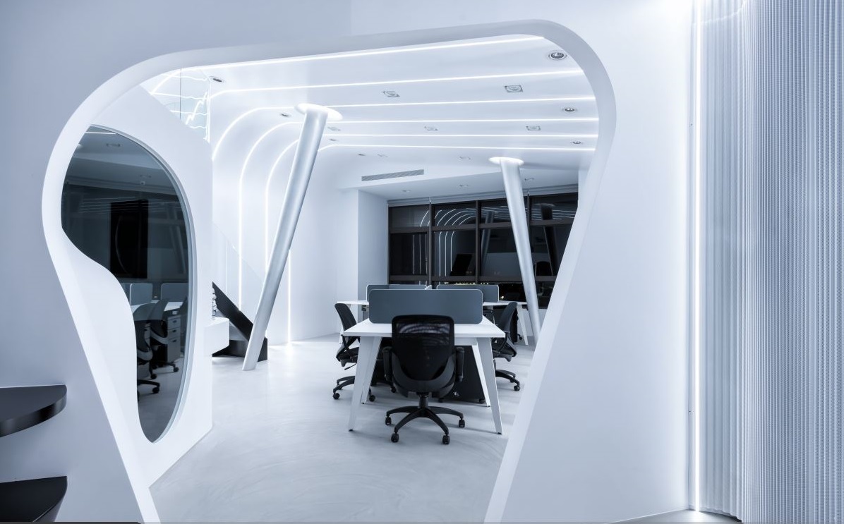 深圳尚泰裝飾的設(shè)計師運用未來與太空艙為核心概念,融入 28 坪的商業(yè)空間,借由材質(zhì)的視覺與觸覺,打造一處仿佛穿梭至未來的辦公室。