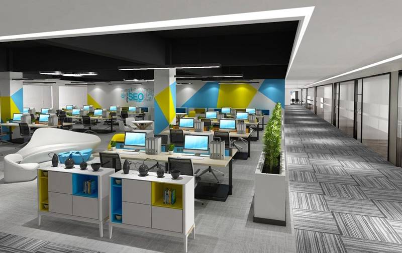 二樓空間職能上的巧妙轉(zhuǎn)換,開(kāi)放辦公區(qū)文化墻通過(guò)黃,藍(lán),灰,白等幾個(gè)大色塊的簡(jiǎn)單劃分,營(yíng)造活潑輕松的環(huán)境氛圍。利用書(shū)柜、休閑桌椅、綠植作為自然隔斷,降低小團(tuán)隊(duì)之間工作的干擾,既保證員工之間的交流,也創(chuàng)造一定的工作保密隱私性。休閑桌椅與辦公區(qū)的穿插設(shè)計(jì)讓員工擁有片刻休憩的選擇,提高空間利用的可持續(xù)性,提高員工的工作效率。