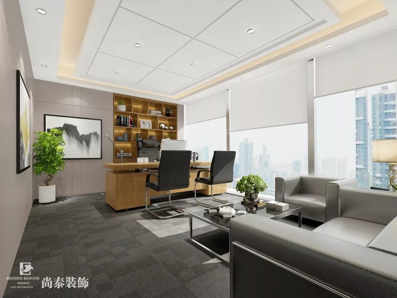 董事長室更為現(xiàn)代成熟,天花采用隱藏燈帶形式,做出時尚光感,