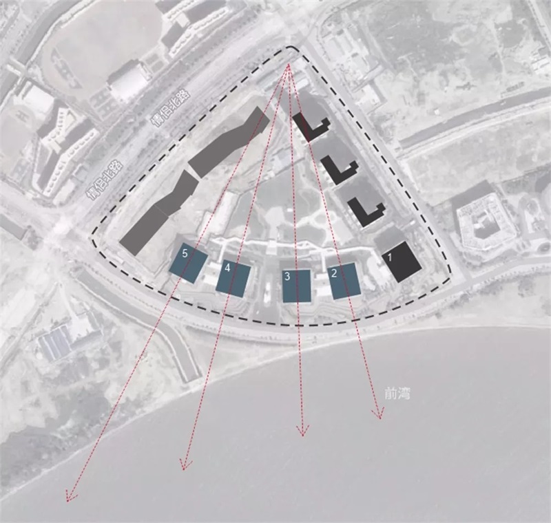 用地輪廓為扇形的新園區(qū)坐落于珠海唐家灣前島環(huán)路的海岸線上,面朝大海,視野遼闊。用于研發(fā)和辦公的1-5號(hào)建筑對(duì)軸扇形圓心向外引出的延長(zhǎng)線,朝向海面依次排列在扇形外長(zhǎng)邊上,是名副其實(shí)的海景辦公樓。2-5棟為兩兩對(duì)稱的四層長(zhǎng)方形幕墻建筑,其中四層的建筑樓層平面后退、縮小,錯(cuò)出了三層屋頂?shù)穆杜_(tái),是最佳的觀海、休閑戶外場(chǎng)地。