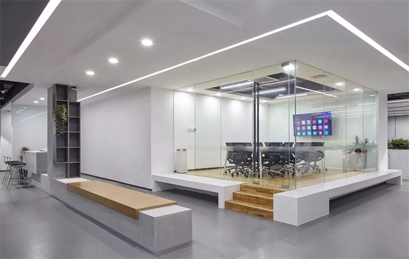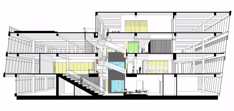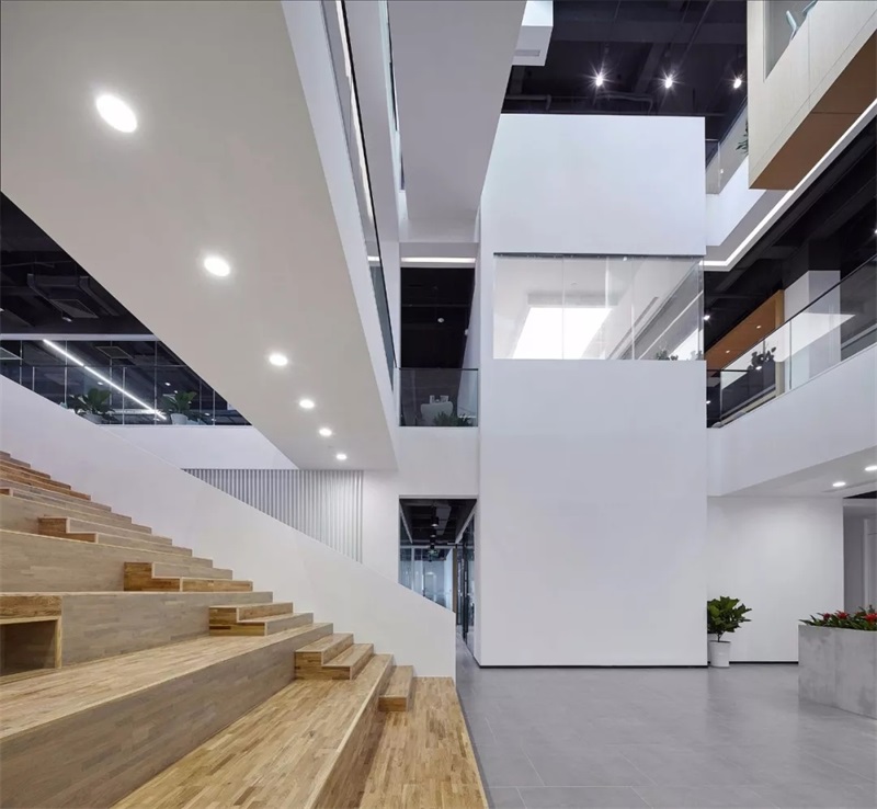 于建筑內(nèi)部我們改造了1-4層中央?yún)^(qū)域的樓板,通過(guò)樓梯、走道、平臺(tái)等空間構(gòu)件的組織連接,形成了集交通、展示、交流功能于一體的核心中庭空間。同時(shí)利用穿插其中的若干矩形體量會(huì)議空間,形成視覺(jué)焦點(diǎn)。