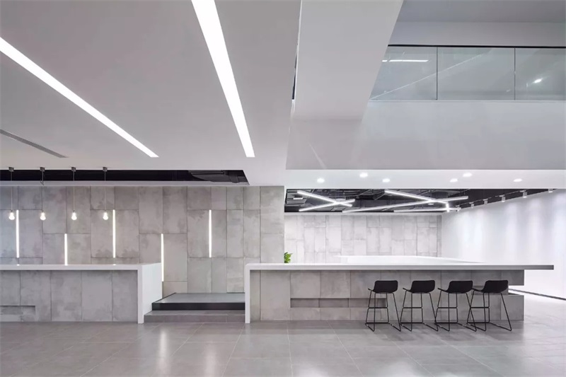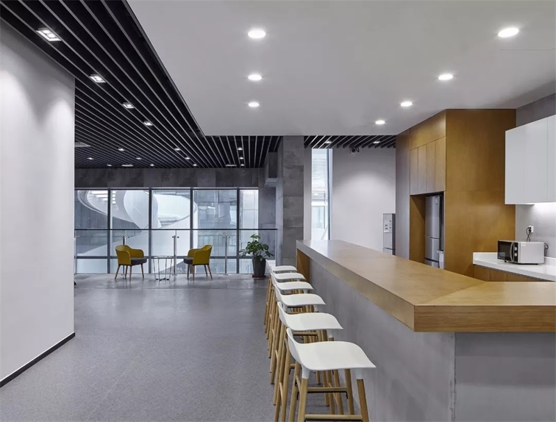 每一層的開(kāi)敞辦公空間,延續(xù)黑白灰風(fēng)格的同時(shí),在一些節(jié)點(diǎn)空間及交流空間的設(shè)計(jì)中融入暖色家具及軟裝布置,除了可以緩和嚴(yán)肅工作氛圍,更為樸素的空間觀感增添了別樣的風(fēng)味。狹長(zhǎng)條形飾燈勾勒出硬朗的結(jié)構(gòu)走線,點(diǎn)布圓形飾燈將柔和的光亮灑遍空間各個(gè)角落。