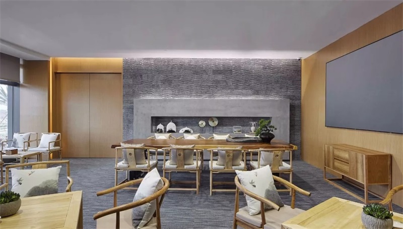 在建筑群的首層靠海一側(cè),相隔設(shè)置了茶室、咖啡、書(shū)吧、售賣等辦公配套設(shè)施。多功能用途的茶室可品茗靜談,亦可接待、會(huì)議。朝海的咖啡廳同外擺結(jié)合,是聚會(huì)、下午茶的理想去處。