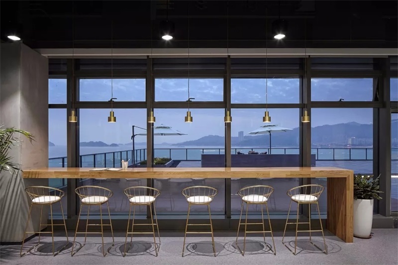 透過(guò)東南方向朝海一側(cè)的大面積落地窗,可將廣袤海景盡收眼底。窗前的高腳吧臺(tái),可容納或三五成群或獨(dú)自思索的辦公人員在此駐足停留。而窗外露臺(tái)不僅可以觀海景,更是聚會(huì)和舉辦活動(dòng)的絕佳場(chǎng)地。人們可以于四個(gè)建筑的寬闊露臺(tái)上遙遙相望,遠(yuǎn)山凝視,濤聲隱隱,真正達(dá)到了舒適宜人的需求。