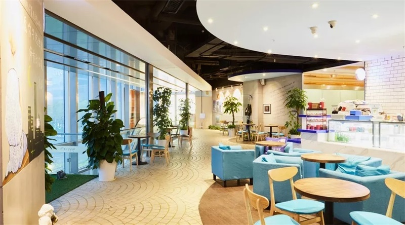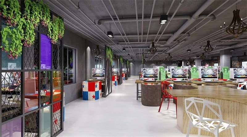 休閑區(qū)不單單是員工飲食的場所,同時也是讓員工感到舒適和輕松的地方。另一方面也是體現(xiàn)公司家文化的場所之一。設(shè)計師的設(shè)計理念是采用暖色的燈光,多處點綴了暖彩色,在中央上設(shè)計了一個吧臺,兩側(cè)則是布置了布藝沙發(fā),有助于員工緩解疲勞。