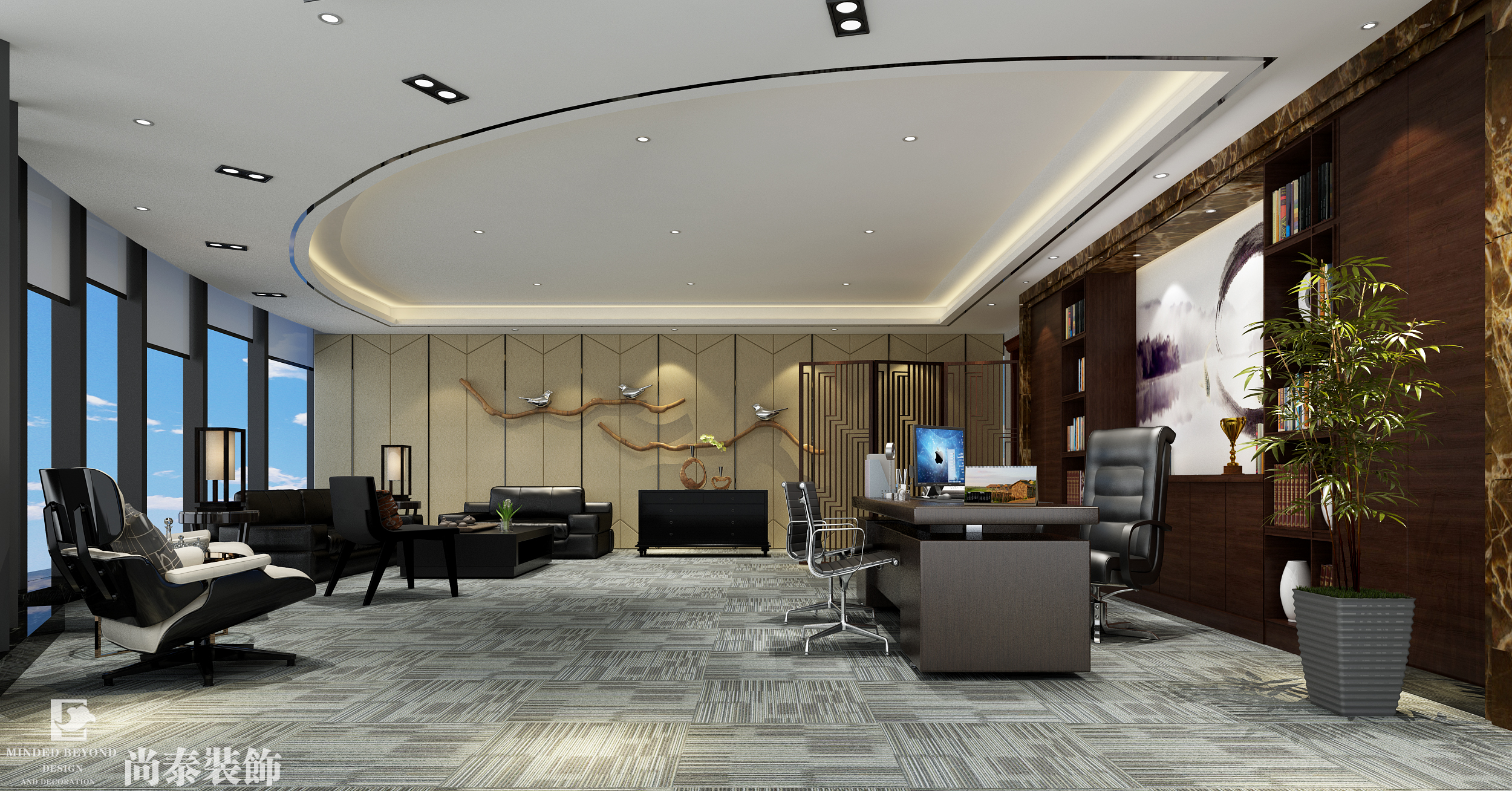 尚泰設(shè)計(jì)師歐夢星:“央企董事長的風(fēng)格選新中式,體現(xiàn)中國文化,又不失時(shí)尚科技感。而董事長是公司的最高職務(wù),所以在我的設(shè)計(jì)中給他選擇了一個(gè)比較好的朝向,幾何式的木質(zhì)辦公家居沉穩(wěn)莊重,彰顯集團(tuán)實(shí)力。另外,兩位老總辦公室采用現(xiàn)代型風(fēng)格,簡單而有品位,色調(diào)冷暖結(jié)合,比較統(tǒng)一?!?/p>