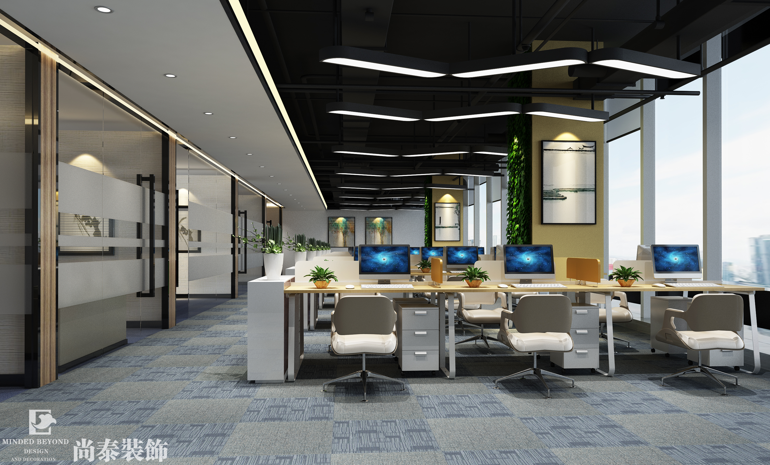 開放辦公區(qū)的設(shè)計(jì),造型流暢,大量運(yùn)用線條,用植物裝點(diǎn)各個(gè)角落,著力營造一個(gè)舒適的工作環(huán)境。
