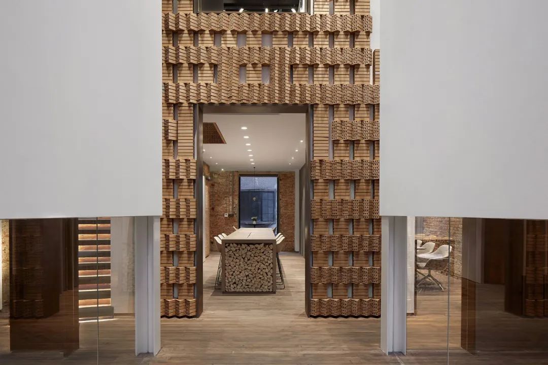 精致的磚墻成為了室內(nèi)最主要的視覺焦點,進入室內(nèi) ,可以看到一片橙棕色的造型精致的空間,設(shè)計采用橙色的燒結(jié)磚組成階梯層次分明的立體墻面,并采用不一樣的排列方式,形成了更豐富的空間肌理。