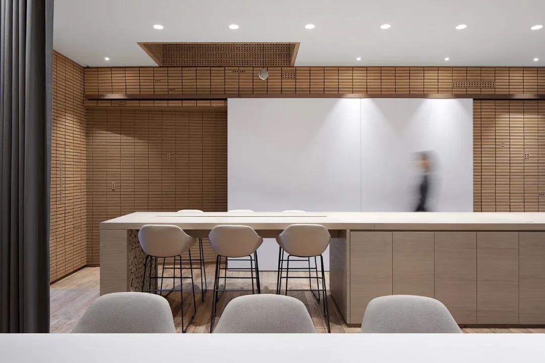 磚墻從一樓延伸到二樓,使得較為狹窄的門戶更具有立體縱深感,形成空間中的視覺焦點。茶水間的磚墻又與其他的不同,相同的大小,統(tǒng)一樣式地整齊排列著,形成平整的空間紋理,沒有凹凸不平,看上去更為精致、細膩一些,給人傳達出溫暖細致的品牌質(zhì)感。茶水間整體吧臺設(shè)計是隱藏式的,想象不到的是,水槽、垃圾收納、冰箱、烤箱、會議線槽等功能都在這里面進行了融合。這樣的設(shè)計既提高了整體空間的視覺美感,又實現(xiàn)了多功能的使用情景。