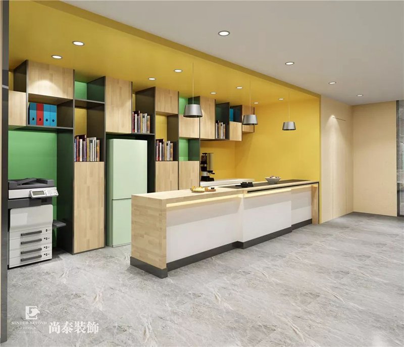 員工們在辛勤工作之余還需解壓,以亮黃色為主色調(diào)茶水間內(nèi)配備了吧臺,餐椅和陳列柜,除了就餐,人們還可以在這里進(jìn)行書籍閱讀,該區(qū)域的設(shè)計活潑又有朝氣!