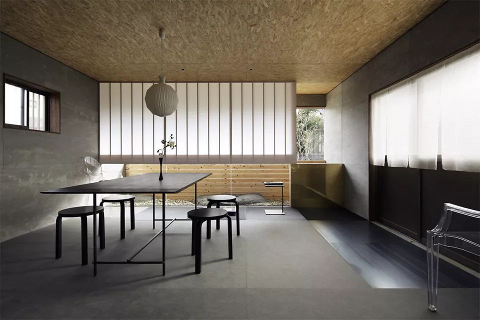 同樣小而美的一處辦公展廳,也充滿了日式寧靜的氣息。紙糊的窗和簾幔,室外的光線透射進(jìn)來,那一層白瑩瑩的光暈,給空間染上一絲朦朧的美感,室內(nèi)空間在一半柔和的木飾中加入黑鐵板和水泥等材料,沖突、矛盾、糅合,至充滿魅力。