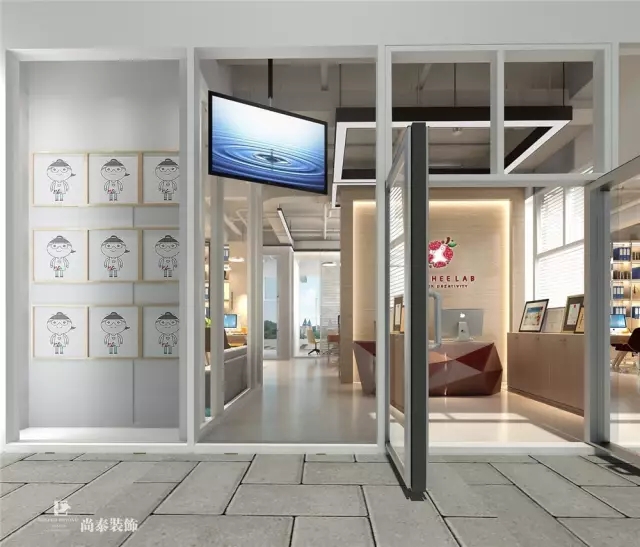 步入前廳接待區(qū),簡潔清晰的前臺造型和右側(cè)的展示柜一下子吸引了人們的眼球,伴著天花板上面燈具照明的效果,該區(qū)域增加了一種開放的氛圍和現(xiàn)代的感覺,使人達成對于創(chuàng)客品牌有效的視覺溝通和傳播。