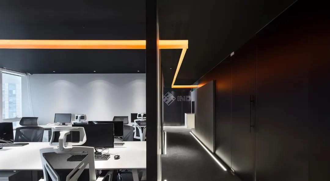 將辦公區(qū)的隔斷打造成格柵形態(tài),和橙色光帶的線條感呼應(yīng)相連,在視覺上更好地拉伸空間的縱深效果,也完成了空間的整體感。大面積黑色的空間很干凈整潔,沒有繁復(fù)濃重的裝飾也很顯設(shè)計(jì),高級(jí)黑搭配亮眼的橙色,讓本身暗沉的空間變得充滿動(dòng)力。