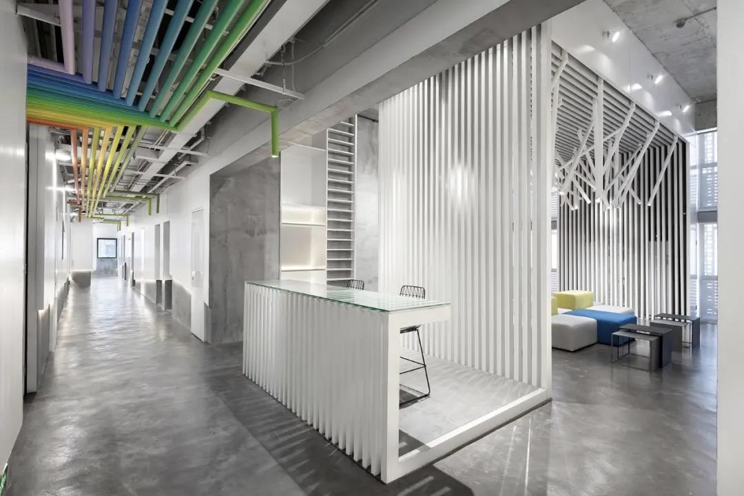 辦公室設(shè)計(jì)甚至打破了單一的色彩,每條線不同飽和度的色彩,給空間注入了更多的變化和活力,漸變的飽和度色彩溫柔靈動(dòng),似一道美麗的彩虹,構(gòu)成一個(gè)神奇的“繽紛世界”。